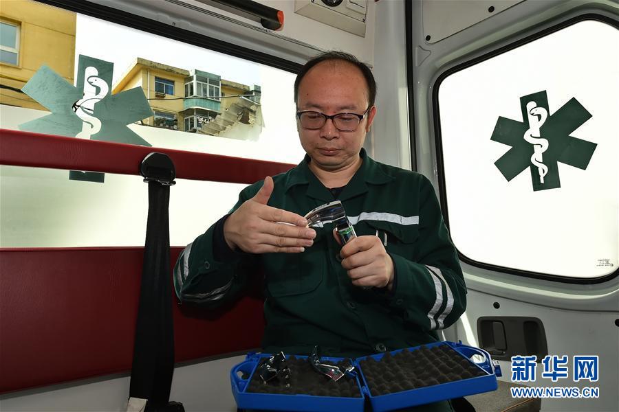 5月11日,許鵬飛在檢查太原市120急救中心急救車(chē)上的設(shè)備。 24小時(shí)候命的急救工作讓夫妻二人很少有時(shí)間顧家,家人的理解和支持讓他們倍感欣慰,同甘共苦的陪伴和救死扶傷的信念是他們堅(jiān)守在護(hù)理崗位的最大動(dòng)力。 -