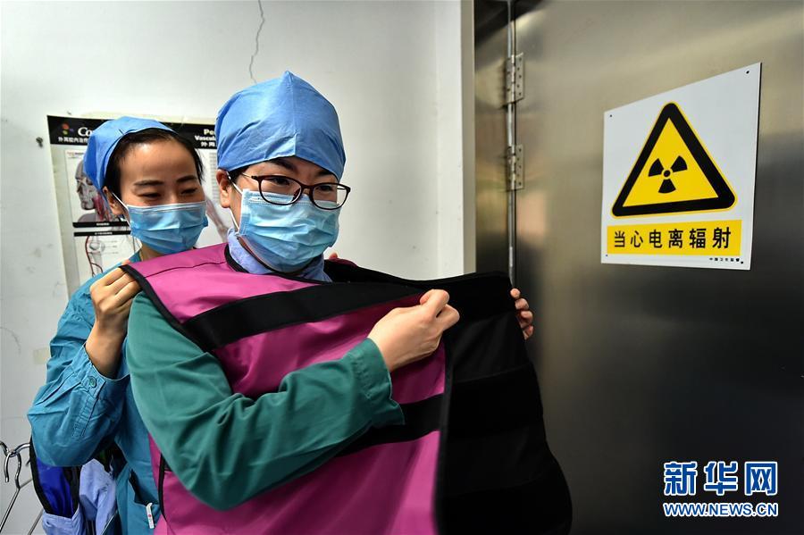 5月11日,山西省太原市中心醫(yī)院心內(nèi)科導(dǎo)管室護(hù)士張娣(前)在同事的幫助下穿著鉛衣。 -