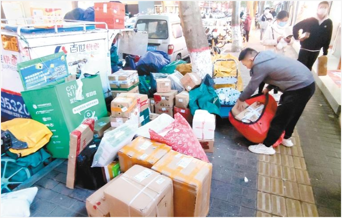在西安光華路上,快遞工作人員正在整理快件。 (記者 竇翊明 攝)
