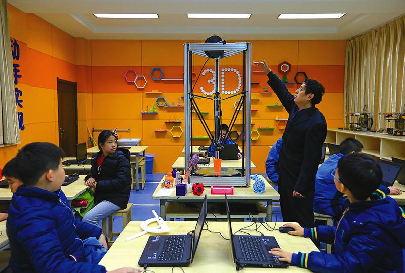 1月6日,西安交通大學(xué)附屬小學(xué)3D打印課上,趙文安老師正在為學(xué)生講解三角洲3D打印機(jī)運(yùn)行原理。3D打印進(jìn)入小學(xué)課堂,讓學(xué)生在課堂上高效完成創(chuàng)意構(gòu)思、三維建模設(shè)計(jì)和成品打印的過程。