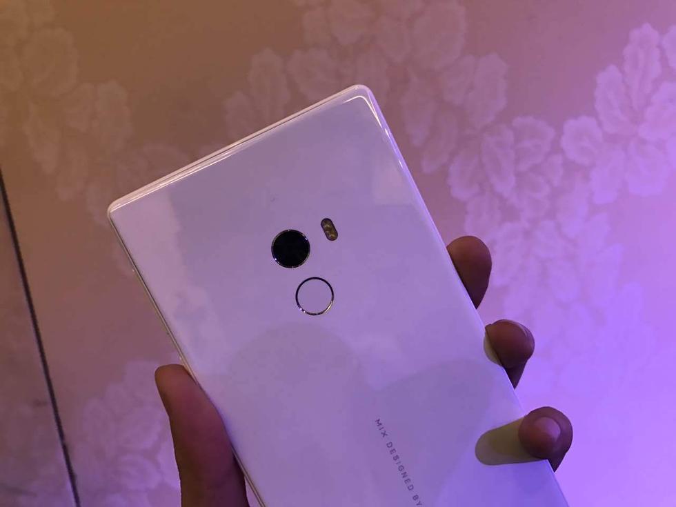 白色版MIX同樣采用了陶瓷作為機(jī)身材質(zhì),背面指紋識(shí)別模塊的外圈和低配版黑色MIX一樣采用銀色外圈裝飾。 -