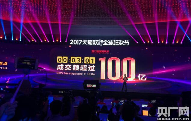 3分01秒,2017天貓雙11全球狂歡節(jié)交易額超100億元。