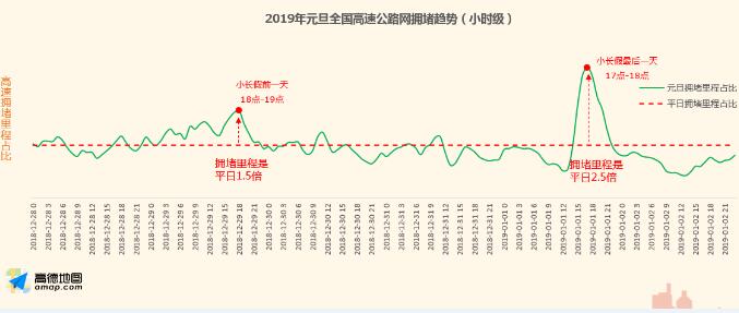 從擁堵時(shí)間來看,全國高速出程擁堵主要出現(xiàn)在小長假前一天傍晚,即2018年12月29日17點(diǎn)-19點(diǎn),擁堵里程為平日1.5倍,返程1月1日15點(diǎn)-20點(diǎn)擁堵程度較高,峰值出現(xiàn)在17點(diǎn)-18點(diǎn),擁堵里程為平日2.5倍。