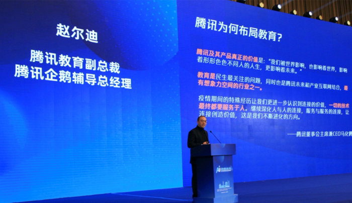 在峰會主論壇,趙爾迪發(fā)表《科技向善:技術推動智慧教育升級》主題演講,系統(tǒng)介紹了騰訊教育成立的背景、目標、業(yè)務、智慧教育解決方案、平臺能力和教育成果。據(jù)他介紹,科技向善是騰訊的企業(yè)使命愿景,通過技術推動在線教育智慧化是騰訊努力的方向。