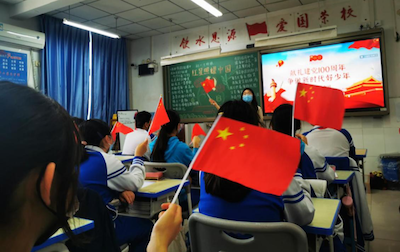 主題班會(huì)由班級(jí)委員會(huì)兩名同學(xué)主持,主題班會(huì)開(kāi)始前5分鐘,兩位班委對(duì)黨的歷史進(jìn)行了簡(jiǎn)要介紹。直播課的第一站是延安,主題為“紅星照耀中國(guó)”,該校師生通過(guò)直播鏡頭,和幾位講解員老師一起走進(jìn)紅色中國(guó)革命圣地延安,走進(jìn)黨史百年歷程中光輝璀璨的延安歲月。
