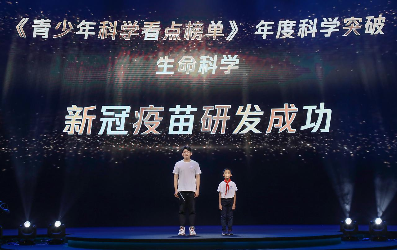 新冠康復(fù)者彭昕燁(19歲)和好奇少年李家齊(9歲)為科學(xué)家頒獎(jiǎng)