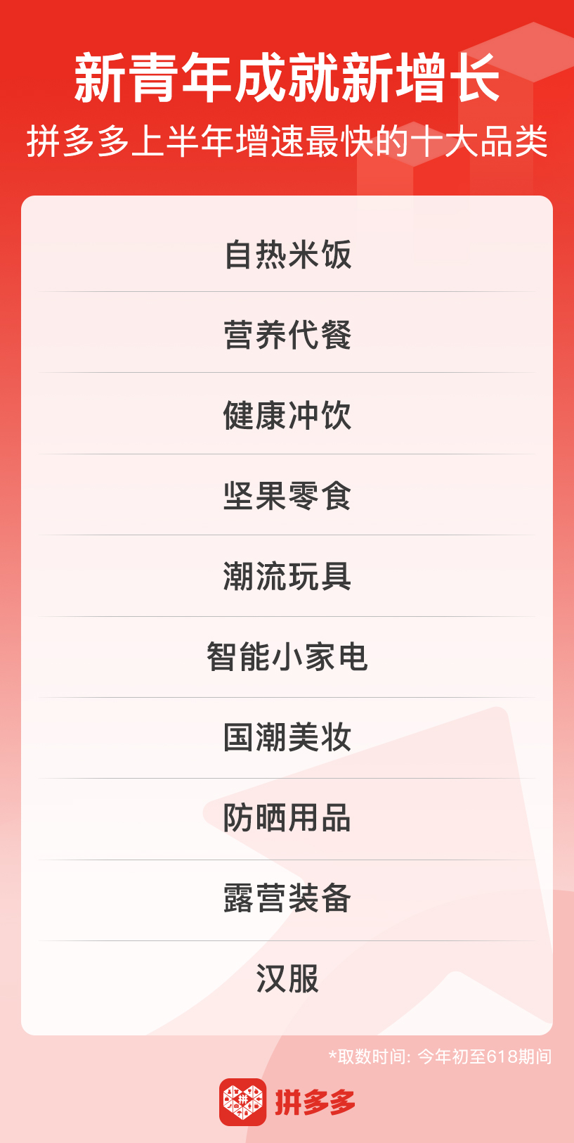 ▲ 拼多多發(fā)布今年初至618期間增長最快的十大消費(fèi)品類,上半年拼單量增幅位列前三的快消品類均與“吃”相關(guān)。