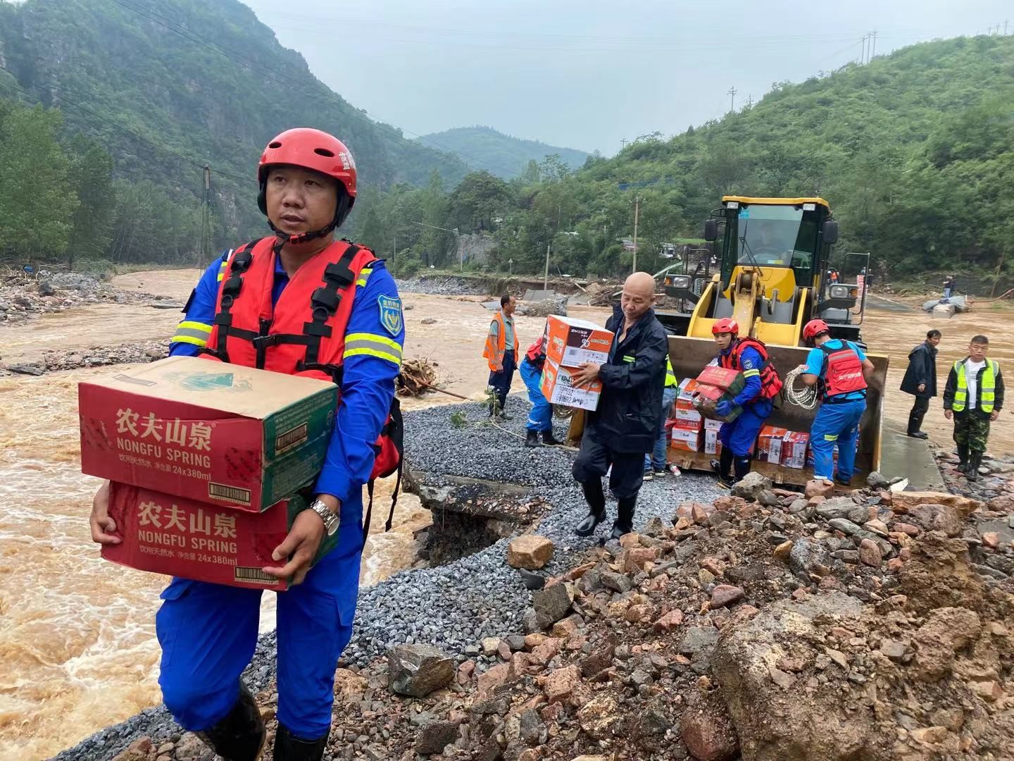 藍(lán)豹救援隊(duì)在鄭州滎陽通過鏟車開路為受災(zāi)群眾運(yùn)送食物。