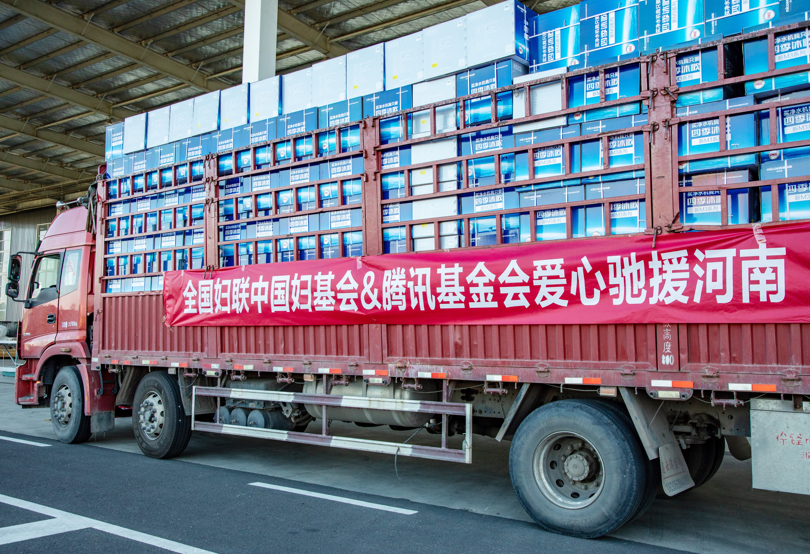 1000件家庭保障箱、1000件救生衣及救援舟艇等救援物資裝車運(yùn)往河南新鄉(xiāng)輝縣