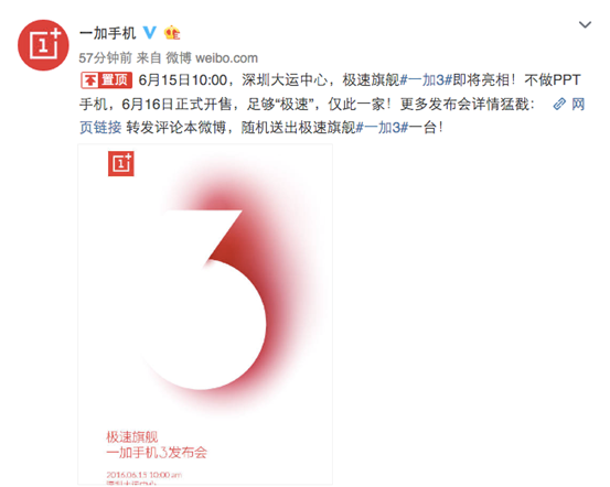 鳳凰科技訊 6月1日消息,一加手機微博正式對外公布極速旗艦一加3將于6月15日上午10點整在深圳大運中心舉行發(fā)布會,并將于發(fā)布會第二天6月16日正式開售。