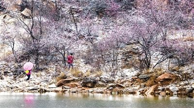 原標(biāo)題:薊州盤山迎桃花雪 游客驚嘆不已
