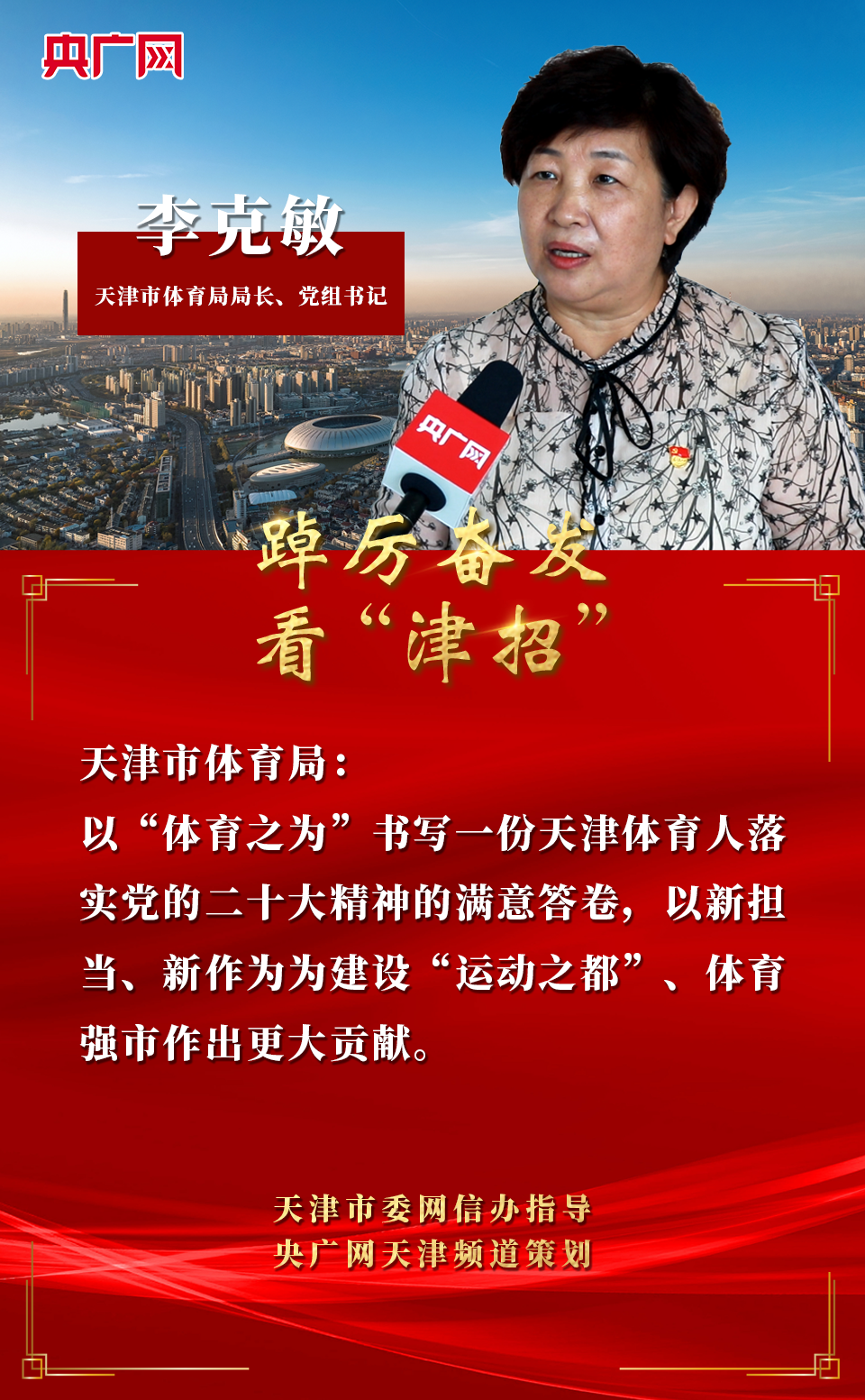 天津市體育局將繼續(xù)以“耕”的精神、“闖”的勁頭、“實(shí)”的作風(fēng),發(fā)揮好體育工作“八項(xiàng)舉措”,切實(shí)推動“十項(xiàng)行動”見成效,以“體育之為”書寫一份天津體育人落實(shí)黨的二十大精神的滿意答卷。