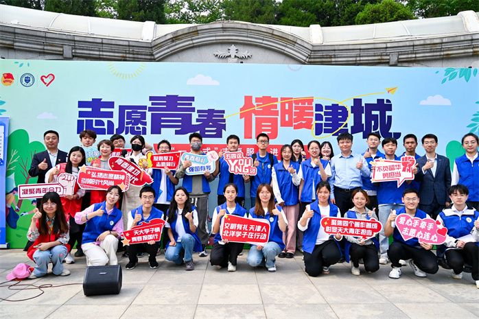 日前,在天津市和平區(qū)五大道街睦南公園,一個個志愿服務攤位交織相連,身穿“北洋藍”的天津大學師生組成一道靚麗風景線,吸引居民游客紛紛駐足打卡。
