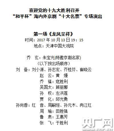 記者了解到,演出采取“多人飾一角,接續(xù)登場(chǎng)”的方式進(jìn)行。其中,13日演出的全本《龍鳳呈祥》將特邀京劇名家朱寶光領(lǐng)銜出演喬玄,由天津京劇院優(yōu)秀青年演員左洪蓮飾演孫權(quán)。昔日的“十小名票”劉小源將與孫志宏、齊桂芬、崔曉云一起聯(lián)袂登場(chǎng)飾演劉備。紅音、周嗣恒、孫元木、冉江紅飾演孫尚香。顧麗娜飾演吳國(guó)太、黃熳飾演趙云、寇勝利飾演喬福、邱光勇飾演賈化、田勝?gòu)?qiáng)飾演周瑜、王惠芳飾演魯肅、于勝利飾演張飛。