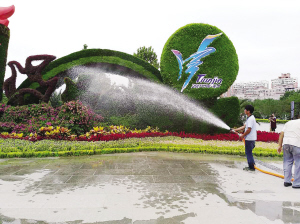 迎接全運(yùn)盛會的到來,本市布置的立體園林景觀,前期的設(shè)計、栽植等工作,園林工人們付出了辛苦的努力。在它們?nèi)A麗亮相之后,繁重的養(yǎng)護(hù)工作就開始了。據(jù)譚國棟主任介紹:從平時的養(yǎng)護(hù)細(xì)節(jié)上,安排了專業(yè)水車,每天進(jìn)行澆水和專業(yè)“養(yǎng)顏”,這里面包括兩大部分,一部分是立體草雕,它們的高度從3米到8米不等,對于這些身材高大的“巨人”,在布置時,就已經(jīng)在它們體內(nèi)設(shè)置了“淋浴”系統(tǒng),通過水車把水輸送到草雕上部就可以實現(xiàn)噴灌、滴灌、滲灌。所以,人們看到的草雕“津娃”,各種運(yùn)動項目造型等等,都那么干凈、茂盛,這都是科學(xué)“洗澡”的功效。另一部分是平面的花卉澆水,主要通過水車,用噴淋,噴灑的形式進(jìn)行水分供給,養(yǎng)護(hù)的時候還要看天氣的情況和花卉本身的干濕度進(jìn)行水分養(yǎng)護(hù),確;ɑ苷IL。