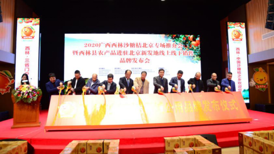 當日,推介會上商賈云集,賓朋滿座,大家一起品桔子,敘友情,謀發(fā)展,求共贏!2020年西林沙糖桔推介活動”正式啟動,將活動氛圍推向高潮;顒又信e行了西林沙糖桔區(qū)域公用品牌揭牌儀式。西林縣與北京新發(fā)地農(nóng)產(chǎn)品發(fā)批市場簽署戰(zhàn)略合作協(xié)議,西林企業(yè)、電商代表與銷售流通企業(yè)進行產(chǎn)銷對接簽約,達成了當日簽約銷售西林沙糖桔近7000噸,產(chǎn)值超過5000萬元。