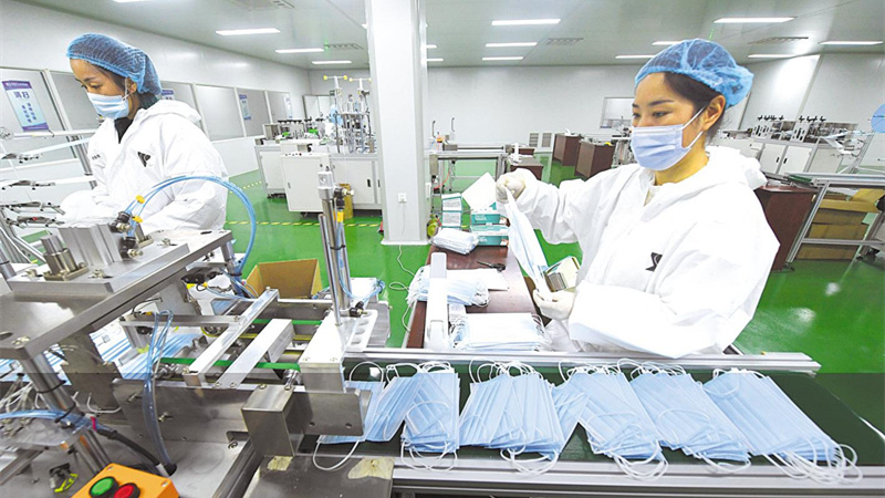 位于湖北省十堰張灣區(qū)的湖北基成防護用品有限公司員工在生產(chǎn)線上忙碌,這里日產(chǎn)口罩50萬只。