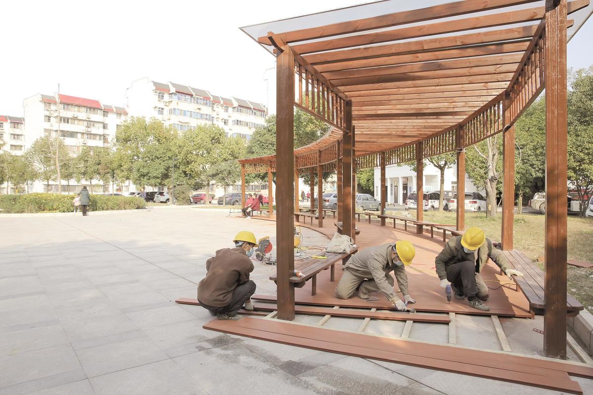 友誼新村小區(qū)“三供一業(yè)”改造即將完成。12月10日,工人在小區(qū)鋪設(shè)涼亭地板。徐春曉 攝