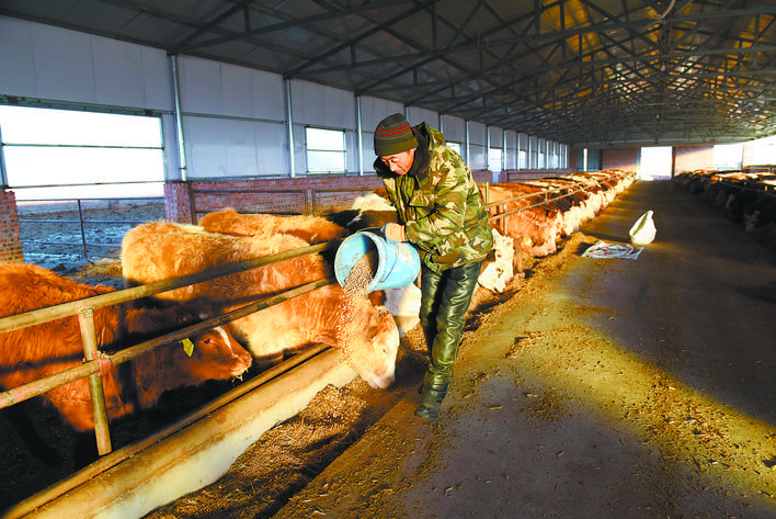 12月12日,內(nèi)蒙古林西縣新林鎮(zhèn)七一村肉牛養(yǎng)殖園區(qū),養(yǎng)殖戶在喂牛。