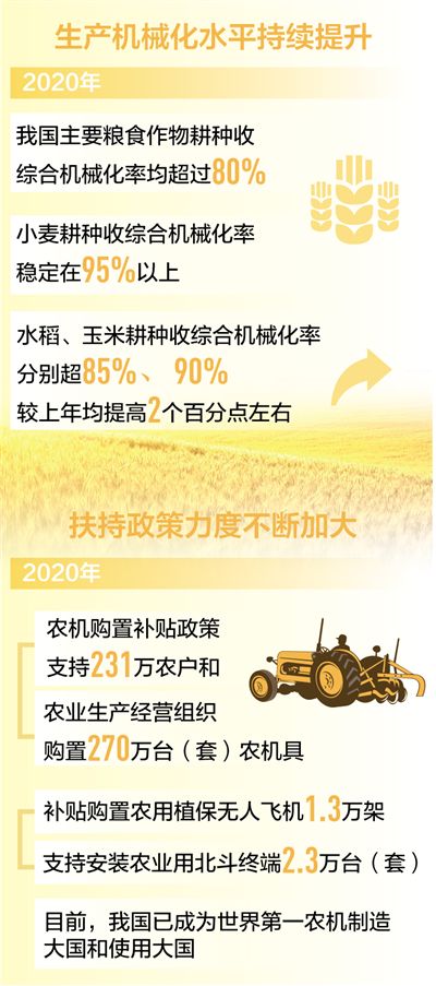 沒有農(nóng)業(yè)機械化,就沒有農(nóng)業(yè)現(xiàn)代化。農(nóng)業(yè)農(nóng)村部數(shù)據(jù)顯示,當(dāng)前我國農(nóng)業(yè)生產(chǎn)進入機械化主導(dǎo)的新階段,各主要糧食作物耕種收綜合機械化率均超過80%。從山區(qū)縱橫馳騁的微耕機,到黑土地上轟鳴的無人智能插秧機,再到自動運行的“植物工廠”,新農(nóng)機促進農(nóng)業(yè)生產(chǎn)效率提升,為鄉(xiāng)村振興提供了重要科技支撐。