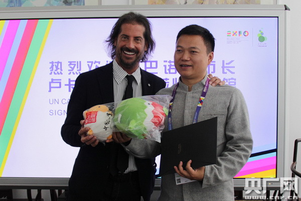 意大利溫泉協(xié)會主席、阿巴諾市市長盧卡·克勞狄奧和中企館執(zhí)行館長王慧(林小軍 攝)