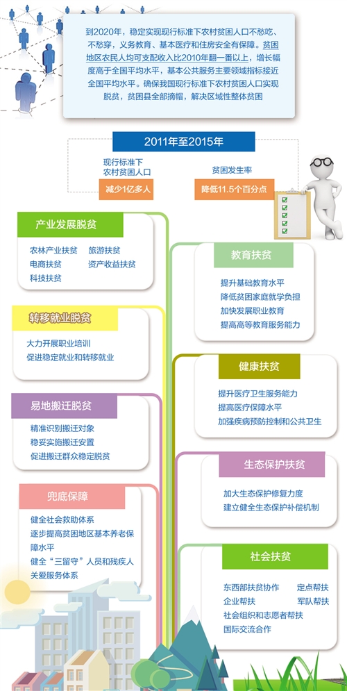 國家發(fā)改委地區(qū)司有關(guān)負(fù)責(zé)人介紹,《規(guī)劃》按照精準(zhǔn)扶貧精準(zhǔn)脫貧基本方略要求,因地制宜,分類施策,從8個(gè)方面實(shí)化細(xì)化了相關(guān)路徑和措施:一是產(chǎn)業(yè)發(fā)展脫貧,主要包括農(nóng)林產(chǎn)業(yè)扶貧、旅游扶貧、電商扶貧、科技扶貧等方面,提出了13項(xiàng)產(chǎn)業(yè)扶貧工程或具體措施;二是轉(zhuǎn)移就業(yè)脫貧,主要從組織開展職業(yè)培訓(xùn)和促進(jìn)轉(zhuǎn)移就業(yè)等方面,提出了6項(xiàng)就業(yè)扶貧行動(dòng);三是易地搬遷脫貧,對“一方水土養(yǎng)不起一方人”地區(qū)建檔立卡貧困人口實(shí)施易地扶貧搬遷,實(shí)現(xiàn)搬得出、穩(wěn)得住、能脫貧;四是教育扶貧,主要從基礎(chǔ)教育、職業(yè)教育和降低貧困家庭就學(xué)負(fù)擔(dān)等方面,提出了一系列行動(dòng)計(jì)劃和措施,不斷提升貧困人口綜合素質(zhì)和就業(yè)技能,逐步消除因?qū)W致貧問題,阻斷貧困代際傳遞;五是健康扶貧,主要從醫(yī)療衛(wèi)生服務(wù)、醫(yī)療保障、疾病防控和公共衛(wèi)生等方面,提出了6大健康扶貧工程,加快推進(jìn)基本公共衛(wèi)生服務(wù)均等化,有效緩解因病致貧返貧問題;六是生態(tài)保護(hù)扶貧,主要從生態(tài)保護(hù)修復(fù)、生態(tài)保護(hù)補(bǔ)償機(jī)制2個(gè)方面,提出了11項(xiàng)重大生態(tài)扶貧工程和4項(xiàng)生態(tài)保護(hù)補(bǔ)償方式,使貧困群眾通過參與生態(tài)保護(hù)實(shí)現(xiàn)脫貧;七是兜底保障,主要從社會(huì)救助、基本養(yǎng)老保障、農(nóng)村“三留守”人員和殘疾人等方面,提出了社會(huì)保障兜底措施,通過筑牢社會(huì)保障安全網(wǎng),解決好特殊困難群體和弱勢群體的脫貧問題;八是社會(huì)扶貧,主要從東西部扶貧協(xié)作、定點(diǎn)幫扶、企業(yè)幫扶、軍隊(duì)幫扶、社會(huì)組織和志愿者幫扶,以及國際交流合作等方面,提出了相關(guān)措施和要求。