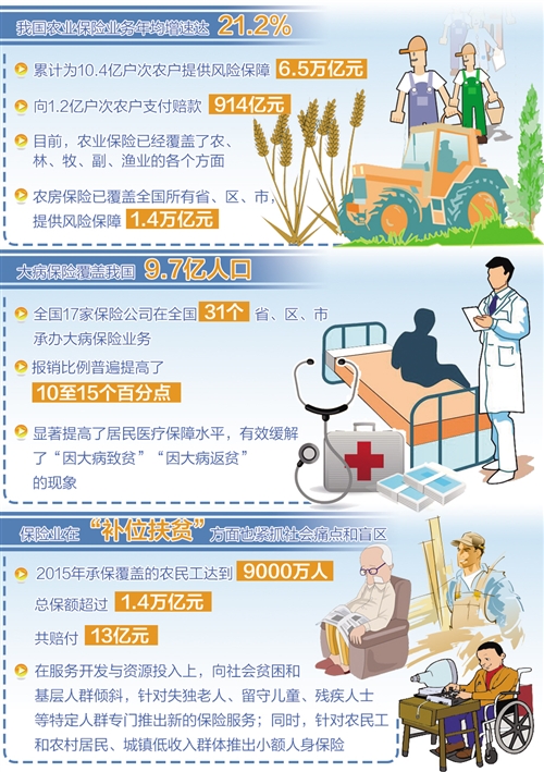 事實(shí)上,在當(dāng)前各種支持“三農(nóng)”建設(shè)的力量中,保險(xiǎn)業(yè)是主力之一。數(shù)據(jù)顯示,2016年1月份到11月份,農(nóng)業(yè)保險(xiǎn)原保險(xiǎn)保費(fèi)收入為390.49億元,同比增長(zhǎng)11.18%!笆濉睍r(shí)期,我國(guó)農(nóng)業(yè)保險(xiǎn)業(yè)務(wù)年均增速達(dá)21.2%,農(nóng)業(yè)保險(xiǎn)累計(jì)為10.4億戶次農(nóng)戶提供風(fēng)險(xiǎn)保障6.5萬(wàn)億元,向1.2億戶次農(nóng)戶支付賠款914億元。特別是2007年到2015年間,農(nóng)業(yè)保險(xiǎn)業(yè)務(wù)規(guī)模增長(zhǎng)迅猛,年均保費(fèi)增長(zhǎng)率高達(dá)51.65%。