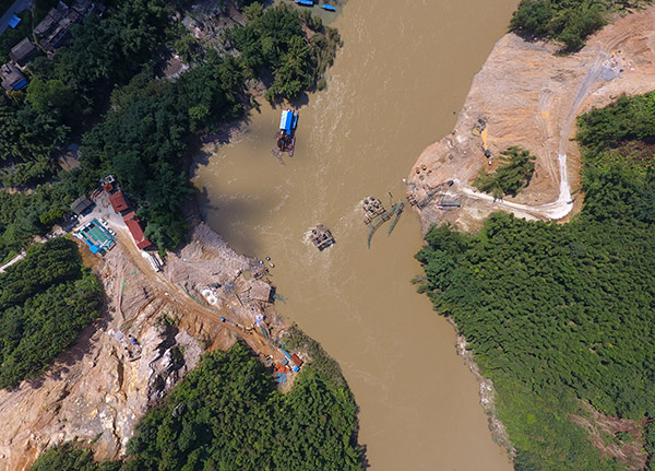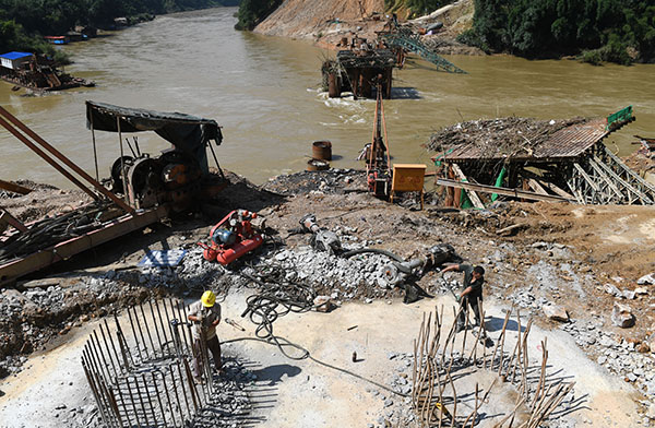 7月12日,在廣西融水苗族自治縣四榮鄉(xiāng)四合村,工人在一座被洪水沖垮的浮橋工地上施工。