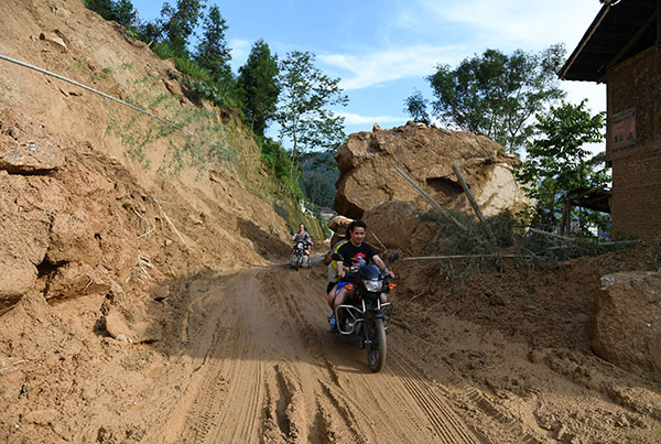 7月12日,在廣西融水苗族自治縣香粉鄉(xiāng)雨卜村卜令屯,村民騎摩托車從塌方路段經(jīng)過。