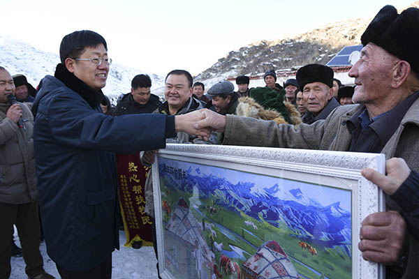 在距離塔城市300公里的托里縣多拉特鄉(xiāng)“冬窩子”哈拉包爾,阿克塞村村民領(lǐng)到援疆干部送來的生活物資(12月3日攝)。