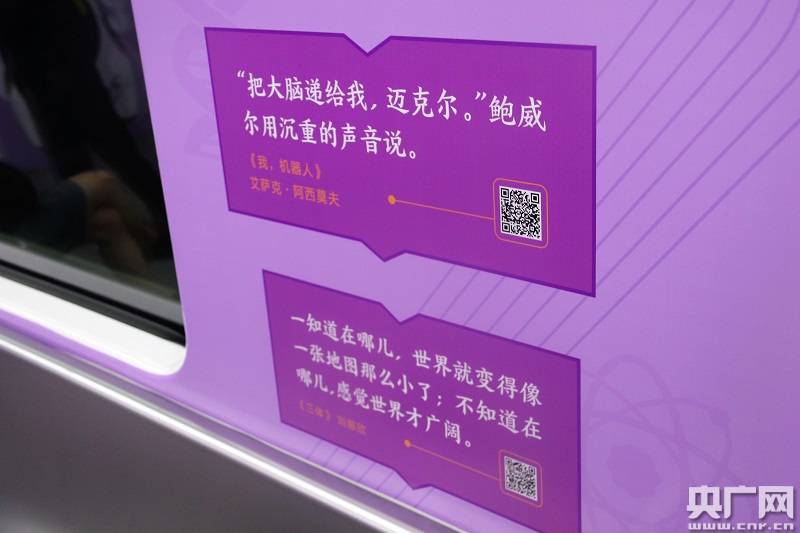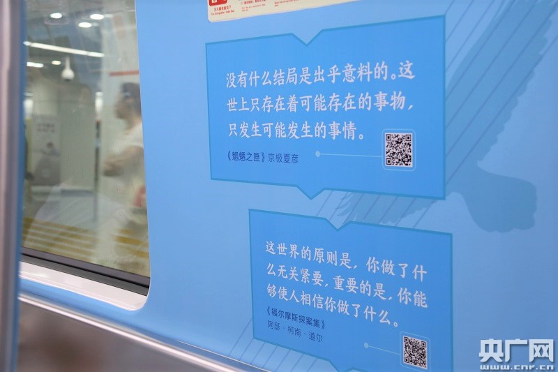 上午10點45分,陳先生帶著放暑假的兒子在慶春廣場地鐵站,坐上了彩虹悅讀列車。走進車廂,濃濃的閱讀氛圍撲面而來,車廂內(nèi)印著一段段精選書摘,有選自錢穆先生《中國歷代政治得失》的“講歷史,更可叫人不武斷。因事情太復(fù)雜,利弊得失,歷久始見,都擺開在歷史上”;有摘自古龍《絕代雙驕》的“知道的越多,就害怕的越多,倒不如索性什么都不知道,無論遇著什么人,都可以不管三七二十一先和他拼了再說”;有選自東野奎吾《惡意》的“令他害怕的,并非暴力本身,而是那些討厭自己的人所散發(fā)的負面能量。他從來沒有想象過,在這世上竟然會有這樣的惡意存在”;還有選自加西亞·馬爾克斯所著《霍亂時期的愛情》的愛情告白:“愛情是一種本能,要么第一次就會,要么就一輩子也不會”等等。