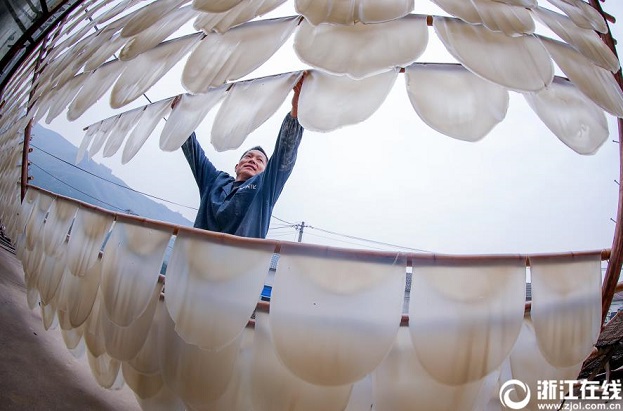 12月14日,湖州長興毛家店村村民正在忙著趕制、晾曬粉皮和粉絲。據(jù)悉,立冬后做粉皮是毛家店村的傳統(tǒng)習俗,也是粉皮、粉絲的銷售旺季,個別農(nóng)戶四個月收入可達十萬元左右。村民們在傳承傳統(tǒng)手藝的同時,也增加了收入。(浙江在線拍友 陸一平 攝)