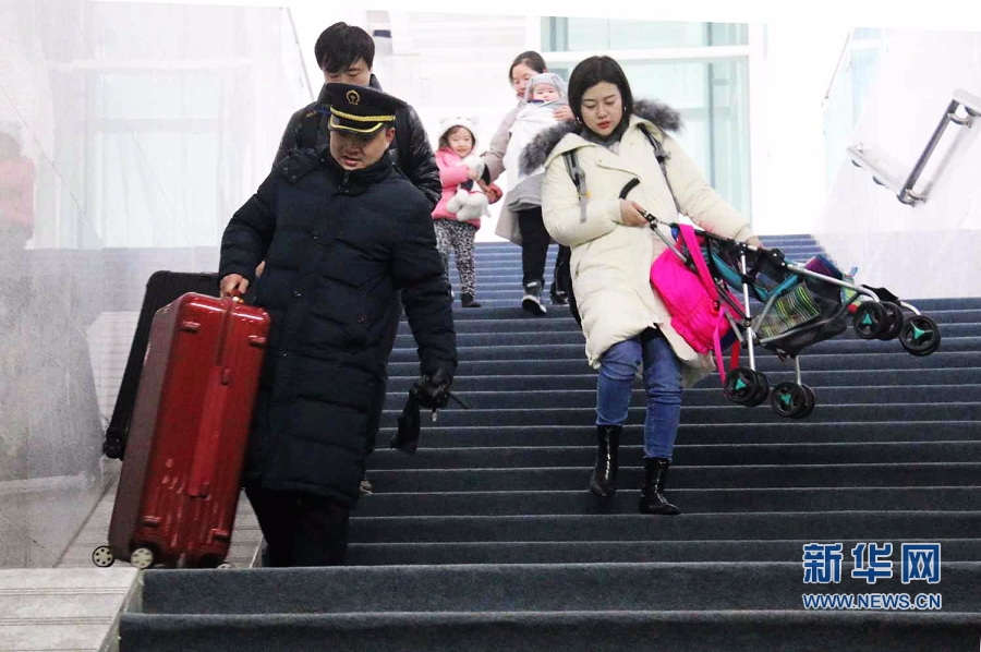 惡劣天氣,地面濕滑,為防止老弱病殘?jiān)械刃袆?dòng)不便旅客摔傷,商丘車站開通愛心通道,為特殊旅客提供優(yōu)先進(jìn)站、便利出站等服務(wù)。圖為該站高鐵車間職工幫助帶小孩的旅客提行李。