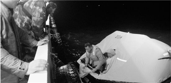終于,救援人員看到了微弱的閃光。救援船頂著風(fēng)浪緩慢地向閃光點(diǎn)靠攏,當(dāng)時(shí)救生筏已偏離原位置1海里左右。