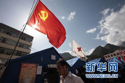8月19日,在舟曲縣一個災(zāi)民安置點(diǎn),一面黨旗迎風(fēng)飄揚(yáng)。新華社記者 任正來 攝