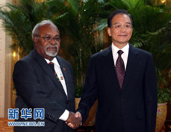 在會見索馬雷時,溫家寶首先祝賀巴新獨(dú)立35周年,相信巴新將在經(jīng)濟(jì)社會發(fā)展方面取得更大成就。溫家寶表示,中國政府鼓勵本國企業(yè)擴(kuò)大對巴新投資,加強(qiáng)在農(nóng)林漁業(yè)、能源資源、電信交通等重點(diǎn)領(lǐng)域的合作。作為太平洋島國的朋友和伙伴,中國愿繼續(xù)提供力所能及的援助,促進(jìn)本地區(qū)的發(fā)展。