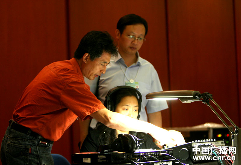 總編室副主任胡國華,技術中心劉宜興與主持人龐瑩調試直播臺。(中廣網(wǎng)記者 陳曉冉 攝)