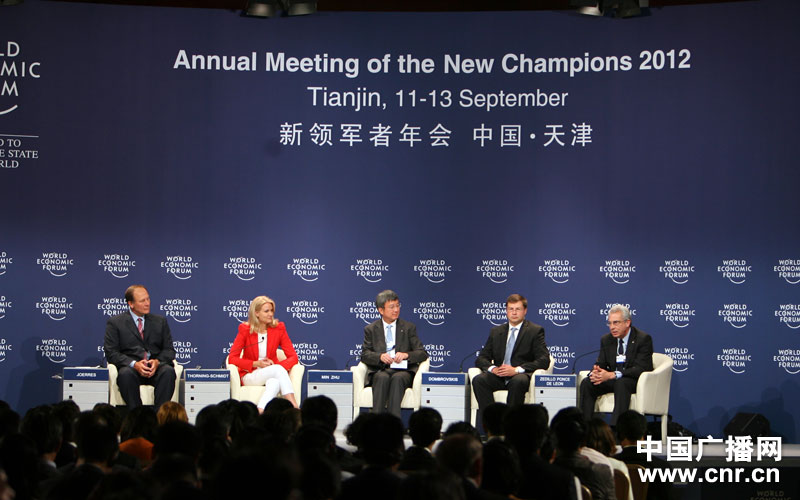 2012夏季達(dá)沃斯論壇在天津梅江會展中心舉行,上午十點半,在達(dá)沃斯廳召開以歐洲危機(jī)及其全球影響為主題的公開會議,國際貨幣基金組織副總裁朱民出席,會議探討了歐盟和新興市場之間的貿(mào)易與投資以及歐元在國際貨幣體系中的作用等內(nèi)容。(中廣網(wǎng)記者 陳曉冉 攝)