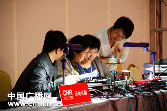 總編室趙威、聶巧與兩位主持人討論直播事宜(中廣網(wǎng)記者劉夢 攝)