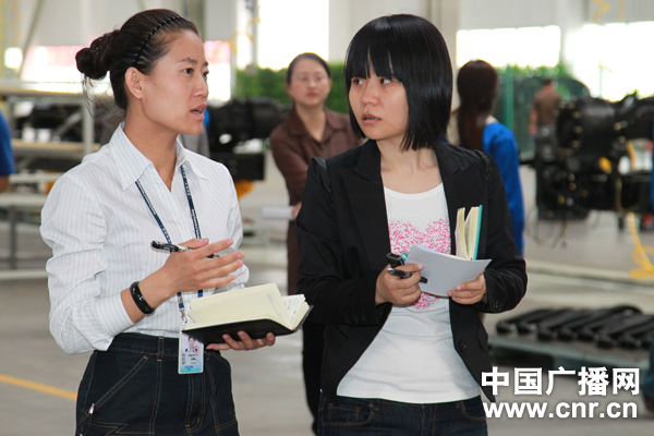 中廣網(wǎng)記者朱虹(右)在“傾聽新疆·走轉(zhuǎn)改”采訪中與陜汽集團(tuán)的工作人員進(jìn)行交流