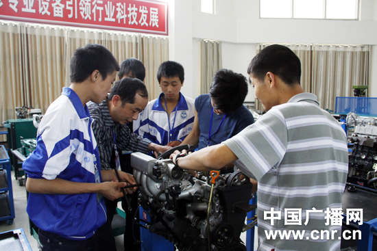 學(xué)校汽修車間內(nèi),師生們動(dòng)手操作(中廣網(wǎng) 李雨楠攝)