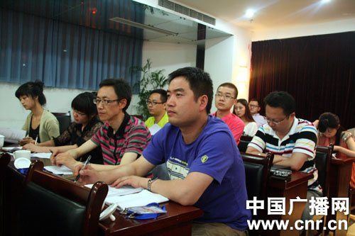 由中國(guó)廣播聯(lián)盟組織的“全國(guó)百家電臺(tái)攜手走轉(zhuǎn)改:我們?cè)诨鶎印备八拇ā白呋鶎、獻(xiàn)愛(ài)心”大型采訪活動(dòng)5月8日在成都市啟動(dòng)。圖中為各聯(lián)盟臺(tái)的記者正在認(rèn)真聆聽(tīng)本次采訪活動(dòng)的主題。中廣網(wǎng)記者李沛 攝