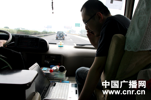 中國(guó)廣播聯(lián)盟組織“全國(guó)百家電臺(tái)攜手走轉(zhuǎn)改:我們?cè)诨鶎印备八拇ā白呋鶎印I(xiàn)愛(ài)心”大型采訪活動(dòng)。圖為5月9日8點(diǎn)22分中央臺(tái)經(jīng)濟(jì)之聲記者張子雨準(zhǔn)時(shí)進(jìn)行直播連線。(中廣網(wǎng)記者肖曉冬 攝)