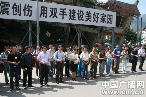 全國百家電臺走轉改報道團在北川地震紀念碑前獻花