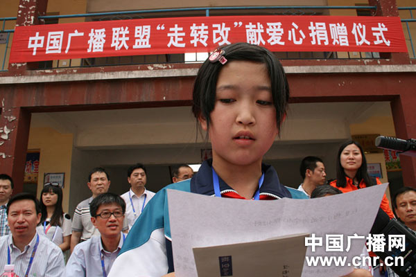 紅星楊小學(xué)學(xué)生代表感謝采訪團愛心捐贈(中廣網(wǎng)記者董浩攝)