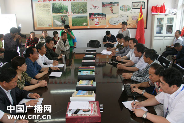 武鄉(xiāng)縣相關(guān)負(fù)責(zé)人在磚壁村向采訪團介紹當(dāng)?shù)厍闆r (中廣網(wǎng)記者董浩攝)