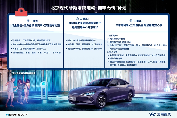 2020年3月10日,北京現(xiàn)代菲斯塔純電動(dòng)——純電時(shí)尚魅力座駕線上發(fā)布會(huì)舉行,現(xiàn)場(chǎng)公布國(guó)補(bǔ)后售價(jià)為17.38-19.88萬(wàn)元,并推出“擁車(chē)無(wú)憂”的購(gòu)車(chē)政策。消費(fèi)者購(gòu)買(mǎi)菲斯塔純電動(dòng)可在國(guó)補(bǔ)后售價(jià)的基礎(chǔ)上再享受3萬(wàn)元的高額購(gòu)車(chē)禮遇,以及3年免息、超值置換補(bǔ)貼等多重福利。