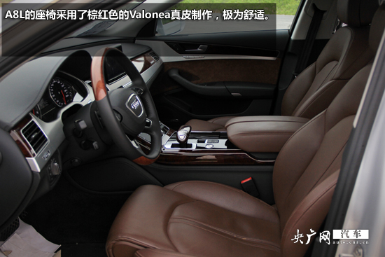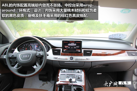 A8L的內(nèi)飾可謂精致典雅,配置高端卻內(nèi)斂而不張揚。中控臺采用wrap-around“環(huán)抱式”設(shè)計,內(nèi)飾采用大量桃木材料和較為柔軟的黑色皮質(zhì),座椅及扶手箱采用的棕紅色真皮搭配,為A8L營造出了的極為尊貴卻又不盛氣凌人的駕乘氛圍。
