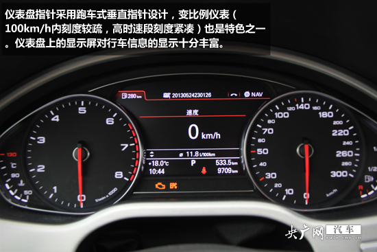 儀表盤指針采用跑車式垂直指針設(shè)計,變比例儀表(100km/h內(nèi)刻度較疏,高時速段刻度緊湊)也是特色之一。儀表盤上的顯示屏對行車信息的顯示十分豐富。