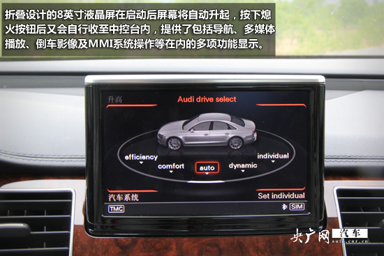 折疊設(shè)計的8英寸液晶屏在啟動后屏幕將自動升起,按下熄火按鈕后又會自行收至中控臺內(nèi),提供了包括導(dǎo)航、多媒體播放、倒車影像及MMI系統(tǒng)操作等在內(nèi)的多項功能顯示。